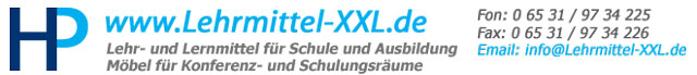Versandkosten* Wir liefern "Frei Haus" ab 178,50 € Bestellwert innerhalb Deutschlands. Bis 178,50 € inkl. Mwst: Versand innerhalb Deutschland (keine Inselfracht): 6,70 EUR inkl. Mwst. (Davon ausgenommen sind Produkte mit Sperrgut- Zuschlag) - Andrea Hoffmann - Lehrmittel & Objekteinrichtung - Gestade 42 - D-54470 Graach Telefon: +49 (0) 6531/9734225 - Telefax: +49 (0) 6531/9734226 - info@Lehrmittel-XXL.de - http://www.Lehrmittel-XXL.de |