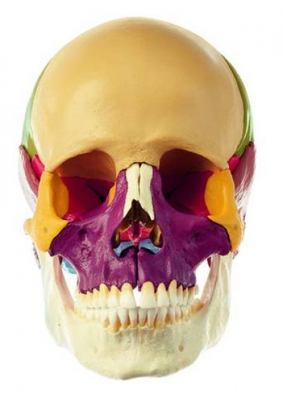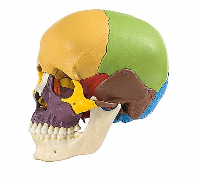 Diese Ausführung des Modells erleichtert das Erlernen von Form und Größe der einzelnen Schädelknochen und fördert damit das Verständnis für den mosaikartigen Aufbau des menschlichen Schädels.