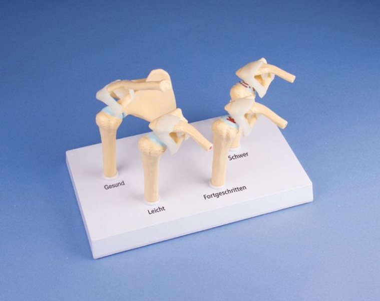 Set mit vier Schultermodellen, verkleinert, die eine degenerative Gelenkerkrankung (Osteoarthritis) des Glenohumeralgelenks darstellen: Erosion am Gelenkknorpel, Fortschritt der degenerativen Erkrankung, Bildung von Osteophyten (Knochensporn) an den Gelenkflächen und Abflachung des Humeruskopfes.