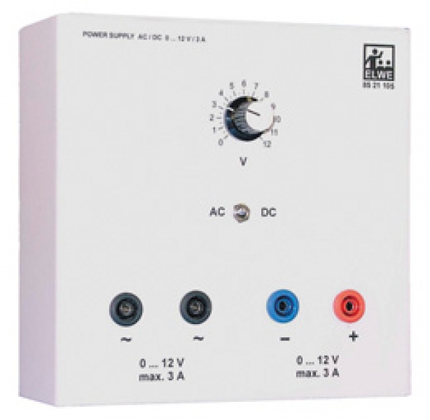 AC/DC-Netzgerät 0 -12 V; 3 A für Schülerübungen mit stufenlos einstellbarer stabilisierter Gleichspannung bzw. stabilisierter Wechselspannung.