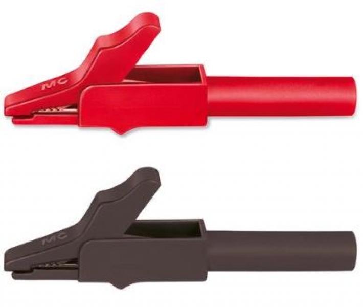 Satz mit 6 Sicherheits-Abgreifklemmen (3x rot, 3x schwarz) mit allseitiger Isolierung.