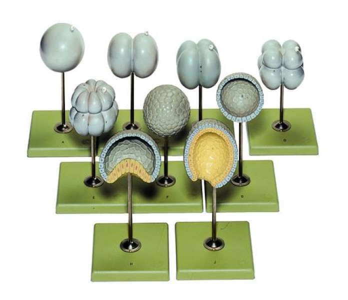 (Branchiostoma lanceolatum, Lanzettfischchen), ca. 500fach vergrößert, aus SOMSO-Plast®. Dargestellt an 9 Modellen (A - J) auf Stativ mit grünem Sockel, die die verschiedenen Stadien der Eifurchung, der Blasen- und Urdarmbildung zeigen. Unzerlegbar.