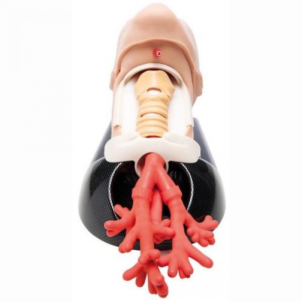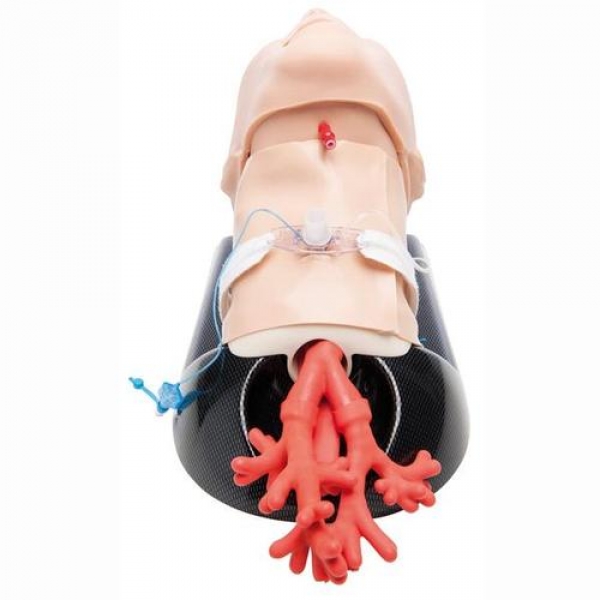 Das Modell verfügt über AirSim X Atemwege und Nasengang, anatomisch korrekt dargestellte Ringknorpel, Kehlkopfknorpel und ertastbare Trachealringe, sowie bis in die vierte Generation anatomisch detailgetreu ausgestaltete Bronchien.