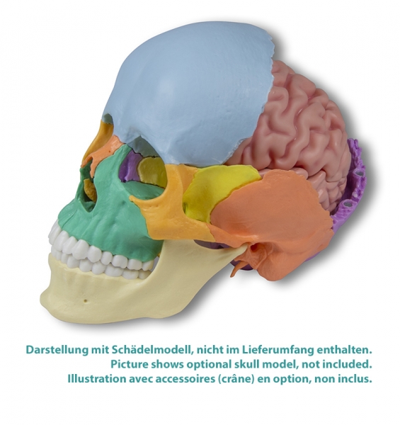 Dieses farblich abgesetzte Steckschädel- Modell eines durchschnittlichen Europäischen Erwachsenenschädels kann in alle 22 Einzelknochen zerlegt werden.