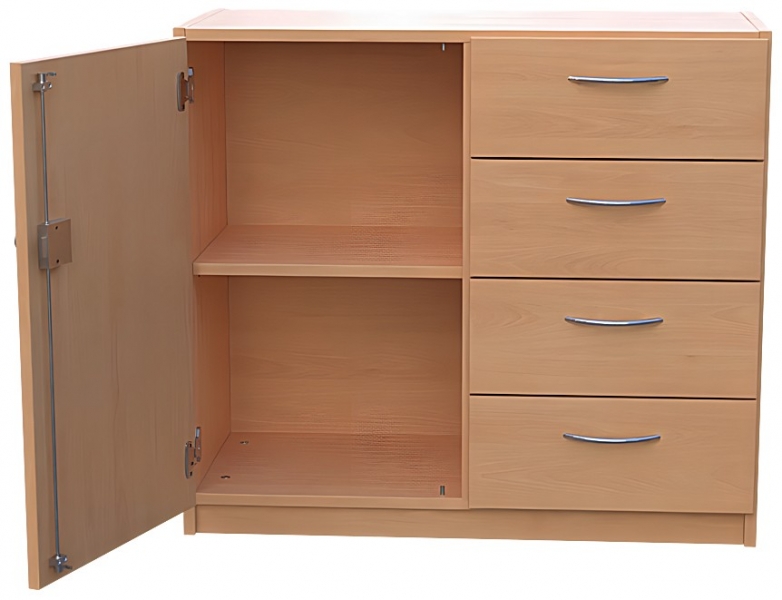 Anrichte, BxHxT 120 x 80 x 60 cm links: 1 Tür, abschließbar,frontbündiges Zylinderschloss, 1 verstellbarer Einlegebodenrechts: 4 Schubkästen mit SoftClose Auszügen, Segmentbogengriffe ( RM 128 mm ) verchromt matt