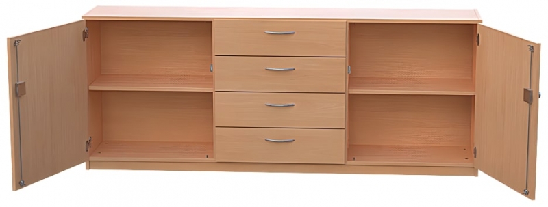 Anrichte, BxHxT 200 x 80 x 60 cm links u rechts: 1 Tür, abschließbar, Segmentbogengriff, ( RM 128 mm ) verchromt matt, frontbündiges Zylinderschloss, je Seite 1 verstellbarer Einlegebodenmitte: 4 Schubkästen mit SoftClose Auszügenmit Segmentbogengriffen ( RM 128 mm ) verchromt matt