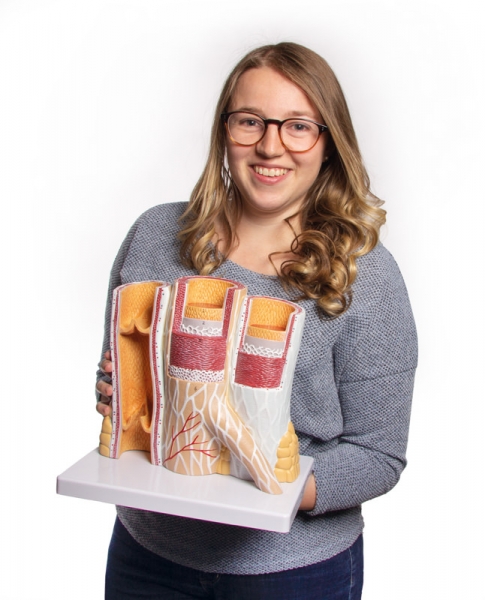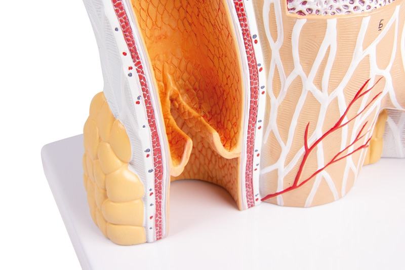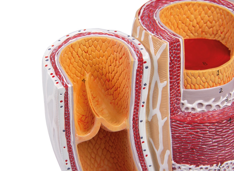Ein wichtiges Hilfsmittel, um den Unterschied zwischen Arterien- und Venen- Histologie zu verstehen. Dieses einteilige Modell zeigt detailgenau zwei Venen und eine Arterie. Eine Vene ist longitudinal geschnitten und zeigt die Venenklappen