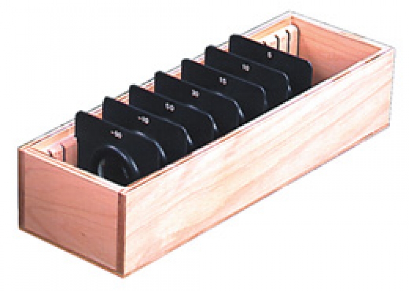 Aufbewahrungskasten aus gedämpftem Buchenholz, klar lackiert, mit 20 Einschüben für Linsen und optische Aufbauteile mit einer Breite von 100 mm.
