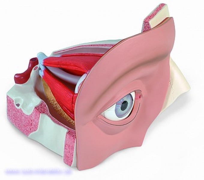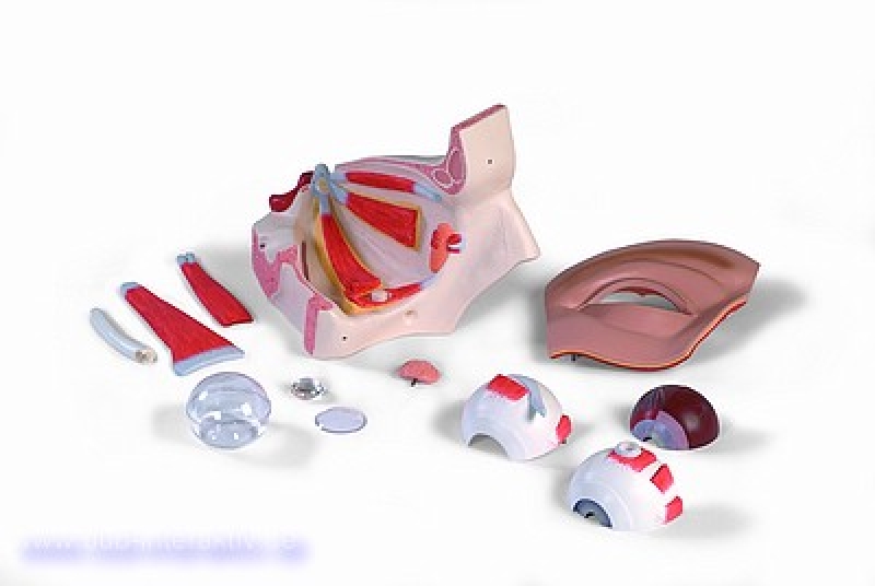 Dieses Modell zeigt den Augapfel mit Sehnerv in seiner natürlichen Lage in der knöchernen Augenhöhle (Boden und mediale Wand). Weiterhin verdeutlichen die umgebenden Strukturen die Beziehung zwischen Auge, Knochen, Muskeln und äußeren Strukturen des Auges.