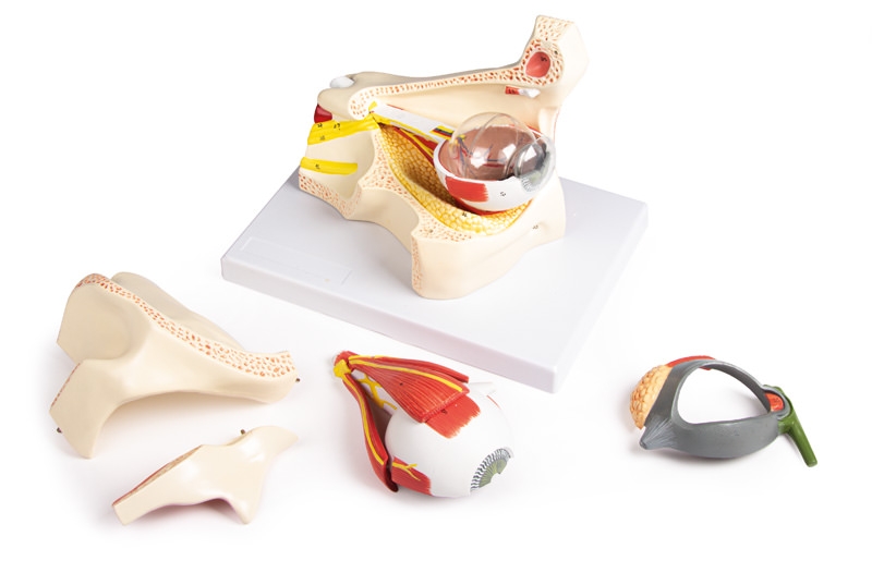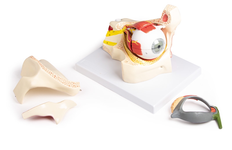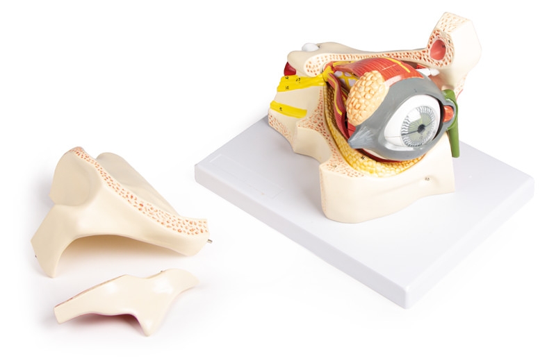 Dieses 13-teilige Modell, in etwa 2,5facher Vergrößerung zeigt die Anatomie des menschlichen Auges. Die Augenhöhle kann in drei Teile zerlegt werden und zeigt dann die folgenden inneren Strukturen: