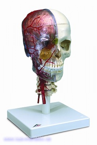 Dieser weltweit einmalige und hochwertige Schädel lässt keine Fragen des Anatomiestudiums mehr offen! Die Möglichkeit, die an der transparenten Hälfte sichtbaren Strukturen auf die knöcherne Hälfte zu übertragen, macht diesen Schädel didaktisch besonders wertvoll.