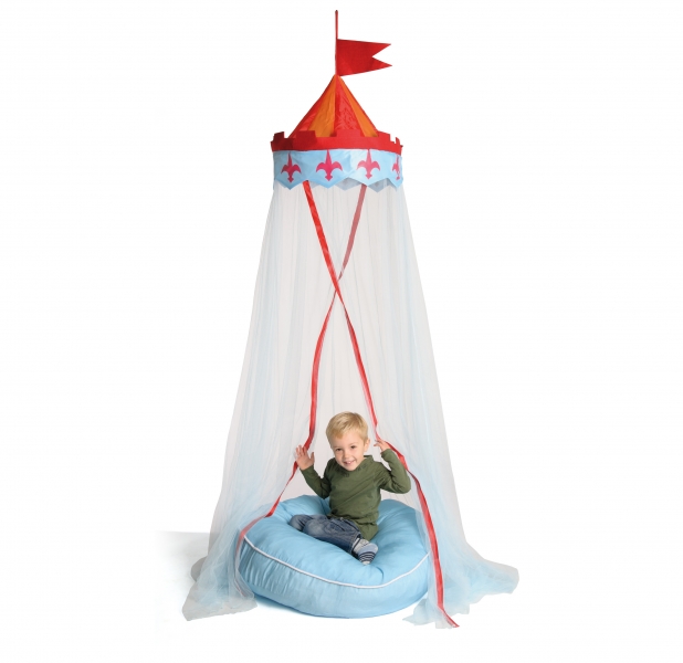 Baldachin "kleiner Ritter"Inhalt: Baldachin, 1 Kissen Ø90 x 20 cm (Bezug waschbar) Wer möchte nicht Ritter sein, oder als König oder Königin seine eigene Burg besitzen? Unter diesem kuscheligen Baldachin mit dem riesigen, dicken Kissen fühlt man sich majestätisch.