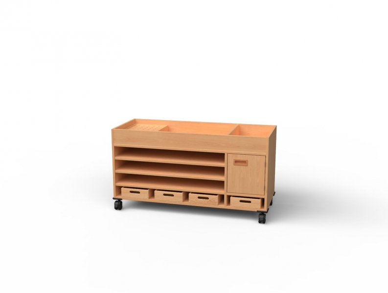 Bastelwagen, BxHxT 125 x 67,4 x 50 cm links: 2 Fachböden, ( 3 Fächer ) unten: 1 großes und 1 kleines Fach 4 Materialkästen mit Griffloch oben rechts: 1 Tür, Muschelgriff; oben: 1 großes Fach mit Aufkantung sowie Pinselhalter und 1 kleines Abteil mit Aufkantung als Ablagefach 4 Rollen, 2 davon feststellbar Kästen: Buche natur, lackiert
