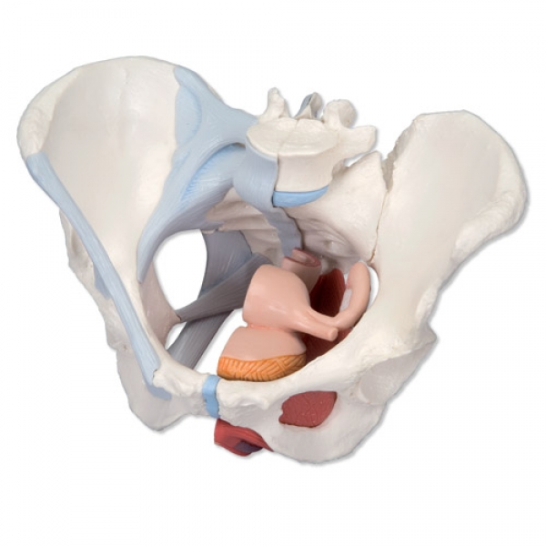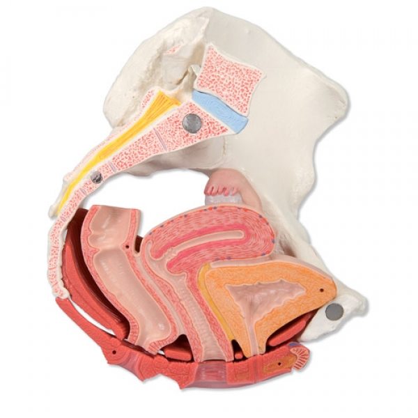Weibliches Becken mit Bändern, mit Medianschnitt durch Beckenbodenmuskulatur und Organen, 4-teilig