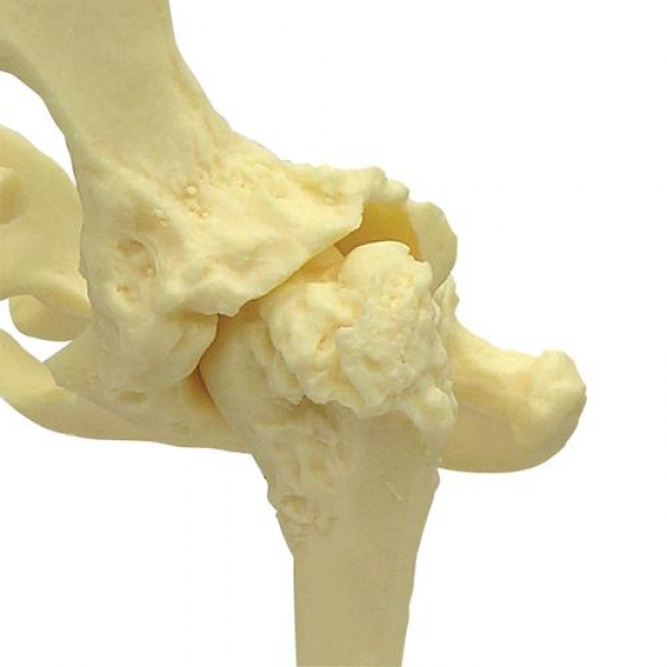 Das Becken durchschnittlicher Größe stellt sowohl normale als auch osteoarthritische Knochen dar, einen Hüftbeinkörper, einen größeren Trochanter, Hüftgelenkspfannenkopf, eine Scheibe mit Bandscheibenvorfall, einen Oberschenkelhals, einen Nerv, ein Kreuzbein, und einen dritten Trochanter.