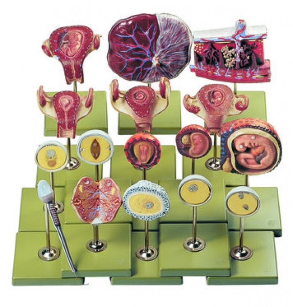 dargestellt an 16 Einzelmodellen aus SOMSO-Plast®. Jedes Modell einzeln auf Stativ mit grünem Sockel.