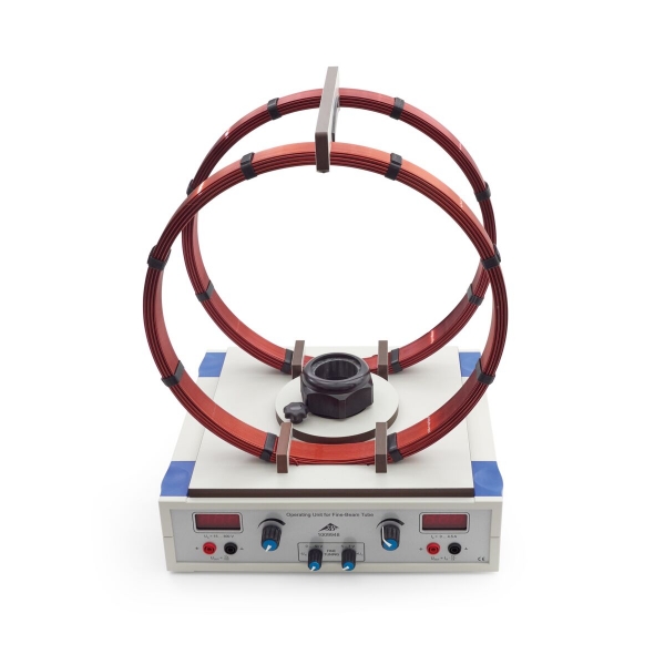 Komplettes Experimentiersystem zur Bestimmung der spezifischen Ladung des Elektrons sowie zur Untersuchung der Ablenkung von Elektronenstrahlen im homogenen Magnetfeld. Komplett mit Fadenstrahlröhre, Helmholtz-Spulenpaar zur Erzeugung eines homogenen Magnetfeldes und Betriebsgerät zur Spannungsversorgung. Fadenstrahlröhre und Helmholtz-Spulenpaar sind auf dem Betriebsgerät montiert, wobei die Fadenstrahlröhre um die vertikale Achse gedreht werden kann. Beide sind intern an das Betriebsgerät angeschlossen, ohne dass eine externe Verkabelung erforderlich ist. Alle Versorgungsspannungen der Röhre sowie der Strom durch die Helmholtz-Spulen sind einstellbar. Anodenspannung und Spulenstrom werden digital angezeigt und können zusätzlich als Spannungsäquivalentwerte abgegriffen werden.