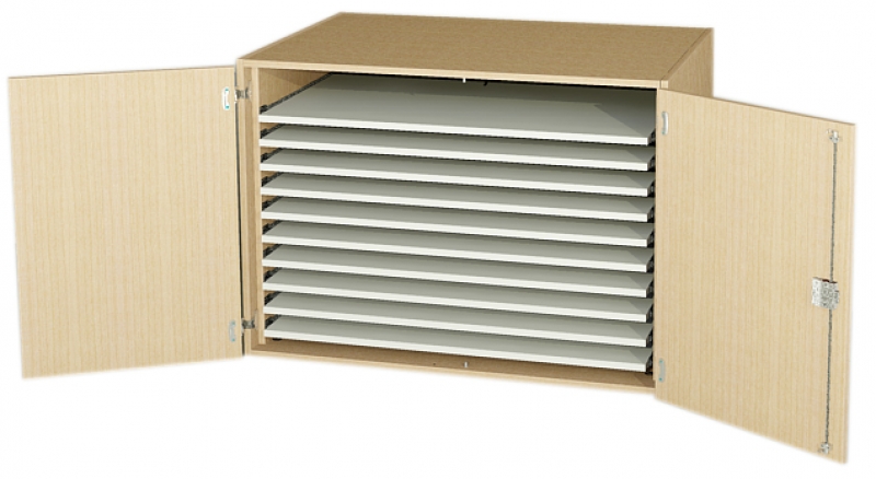 Bilderschrank als Aufsatzschrsank, BxHxT 111 x 79 x 77 cm 2 Türen, abschließbar, frontbündiges Zylinderschloss, 10 Auszugsböden auf Rollenführung Aufbewahrung von Dokumenten bis Format 100 x 70 cm
