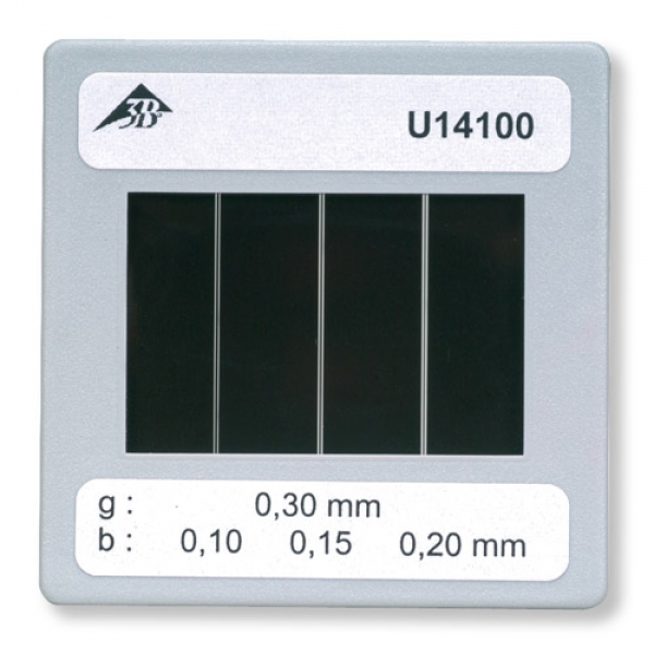 Glasträger mit drei Doppelspalten unterschiedlichen Spaltabstandes für quantitative Beugungsexperimente.