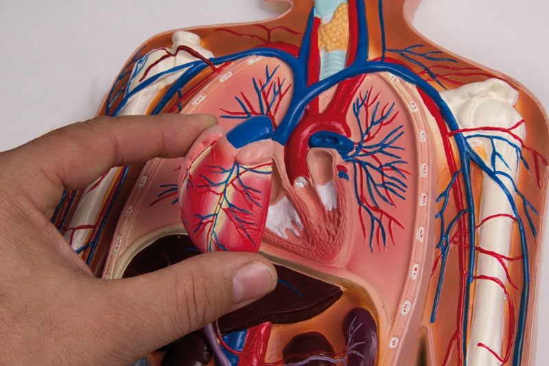 Die vordere Herzwand ist abnehmbar. Zur Lokalisation der Blutgefäße zeigt das Modell auch das Skelett, so dass der dreidimensionale Verlauf der Blutgefäße deutlich wird. Auf Grundplatte, auch zum Aufhängen.