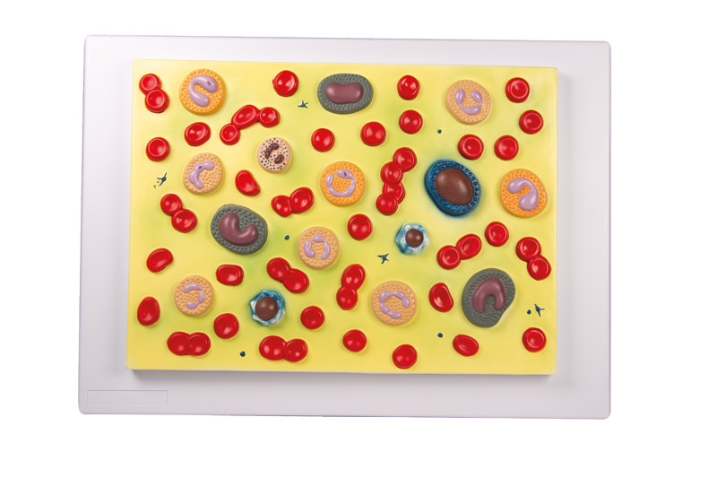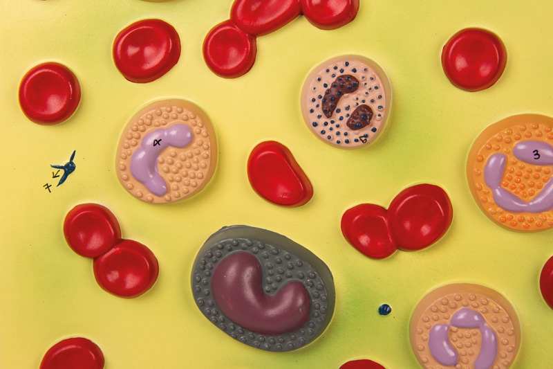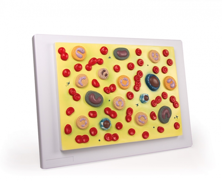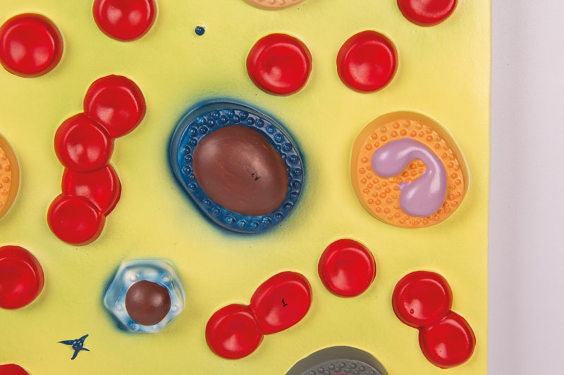 Das Modell zeigt in 2000-facher Vergrößerung die verschiedenen Blutzellarten: Erythrozyten, alle Leukozytenarten und Thrombozyten.