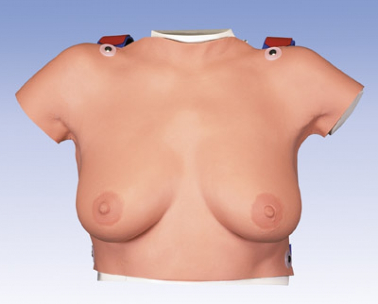 Einmalig realistische Originalabformung eines weiblichen Oberkörpers mit mittlerer Brustgröße zum Erlernen und Üben der Brustuntersuchung.