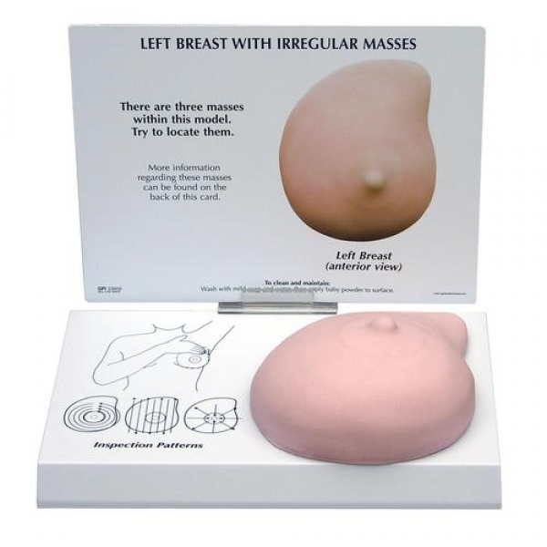 Das Modell in Originalgröße ist aus haltbarem lebensechten Material mit eingebetteten Knoten hergestellt, die eine fibrozystische Masse und einen typischen Tumor simulieren.