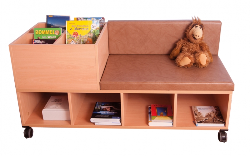Bücherbank, fahrbar BxHxT 150 x 75 / 42 x 60 cm unten: offen, 3 Trennwände, 4 Fächer oben: links Büchertrog mit 4 Mulden oben: rechts: Sitz und Rückenkissen Sitzhöhe: 42 cm farhbar auf 5 Rollen, 2 davon feststellbar