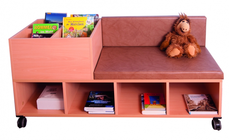 Bücherbank fahrbar BxHxT 150 x 75 / 42 x 60 cm unten: offen, 3 Trennwände, 4 offene Fächer oben links: Büchertrog mit 4 Fächernoben rechts: Sitzbank mit Sitz und Rückenpolster aus Kunstleder 42 cm 4 Rollen, 2 davon feststellbar