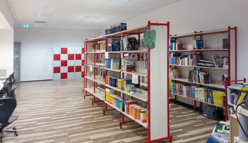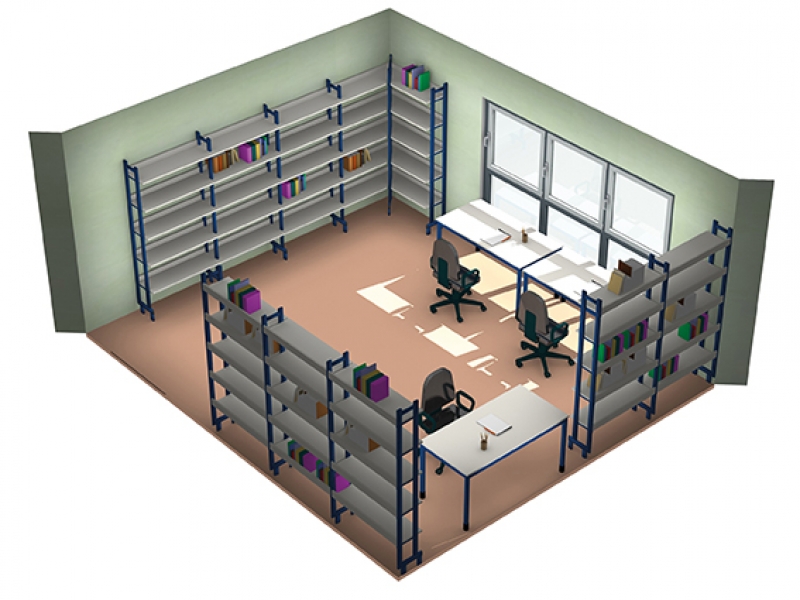 Bücherregal mit  je 1 Sück Grundelement und 2 Stück Anbauelement, doppelseitig, mit 15 Böden mit Stahlunterzug.