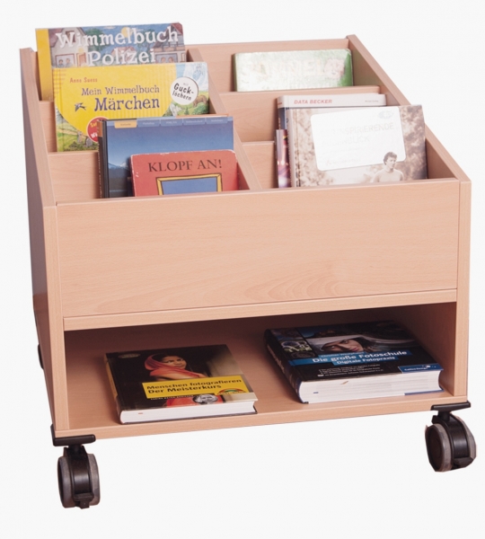 Büchertrog, fahrbar BxHxT 60 x 45 / 60 x 60 cm unten: offenes Fach seitlich mit Schrägschnitt versehen oben: offene Bücherfächer 4 Rollen, 2 davon feststellbar