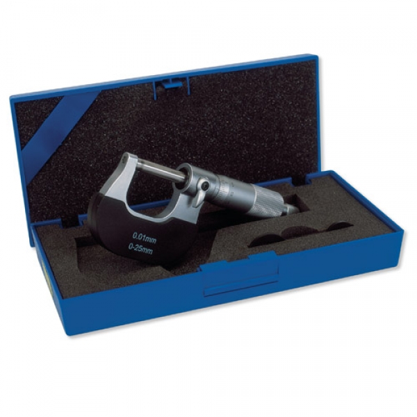 Messflächen hartmetallbestückt, geschliffen und feinst geläppt. Messspindel gehärtet mit geschliffenem Gewinde, Messbügel verchromt mit Isolierschutz, Skalentrommel und –hülse matt verchromt. In Kunststoffetui.