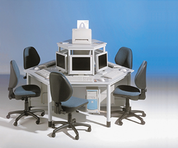 Diese Computerinseln mit melaminbeschichteten Tischplatten mit ABS-Kante im Plattendekor, einem umlaufendem Stahlrohrrahmen und Tischbeinen aus Stahlrundrhr 60/2 mm, ist für Monitore bis 17 Zoll geeignet. Die Verkabelung erfolgt unsichtbar durch die im Zentrum nach unten führenden Kabeldurchlässe. Die Insel besteht aus 2 Trapeztischen 240 x 120/120 x 72 cm und 2 Trapezaufsatztischen B/T: 120x60/60 cm.
