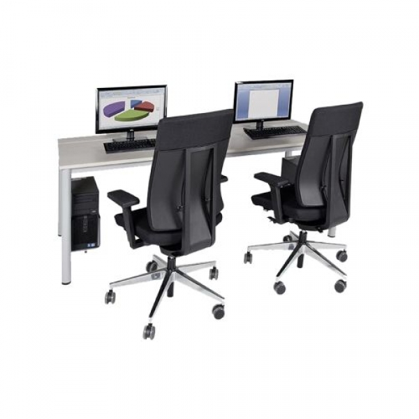 Zusätzlich sind in der Tischplatte zwei Kunststoff-Kabeldurchlassbuchsen verbaut, um Kabel so einfach wie möglich verschwinden zu lassen. Mit dabei ist auch eine 3-Fach Steckdosenleiste, um die Stromzufuhr zu gewährleisten. Der Tisch ist in zwei verschiedenen Tiefen bestellbar und auch die Tischhöhe ist wählbar.