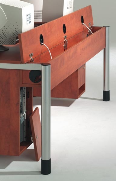 EDV-Tisch mit geschlossenem, groß dimensioniertem Holzkabelkanal (Querschnitt: 12 x 12cm) mit fest installierter 3-fach-Steckdose und 5 m Anschlusskabel.