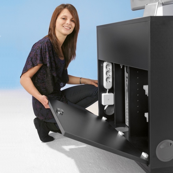 Top modernes Design! Das abschließbare Rollo spart Platz, keine Tür, die nach vorne aufschwenkt. Kabeldurchlässe vereinfachen die Verkabelung.
