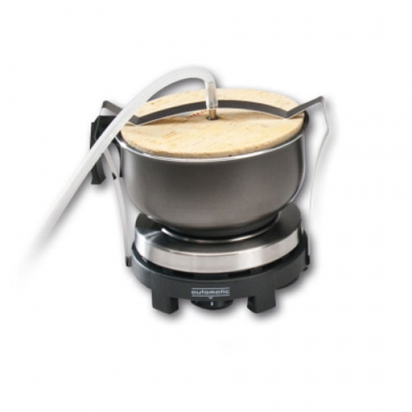 Aluminiumtopf mit Korkdeckel und Haltebügel auf regelbarer Heizplatte mit thermischem Überlastschutz.