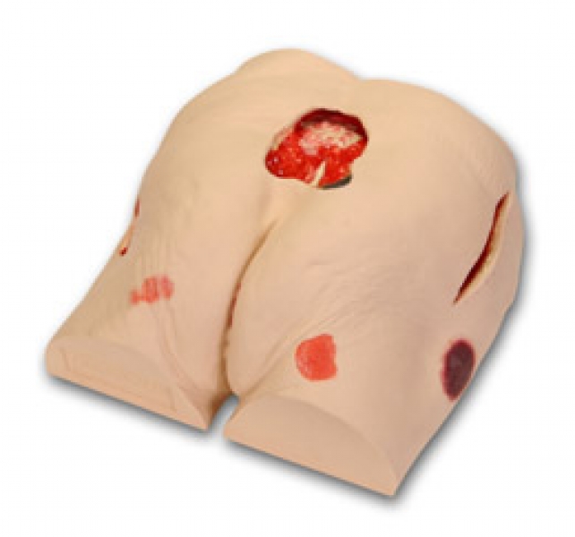 An diesem Modell können Wundreinigung, Klassifizierung, Stadienbestimmung und Beurteilung geübt werden sowie das Vermessen der Länge, Tiefe, Unterminierung und Gewebsablösung.