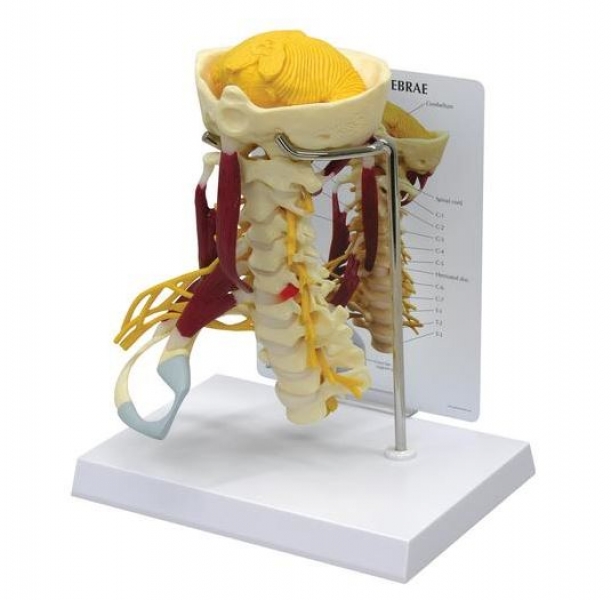 Die Deluxe Halswirbelsäule mit Muskeln ist ein Modell mit Elementen des Hirnstamms in Originalgröße, Hinterhauptbein, Atlas und Achse bis C7, mit Scheibe mit Bandscheibenvorfall, T1 und T3.