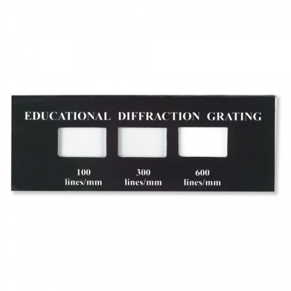 Zur Veranschaulichung des Verhältnisses zwischen Linienabstand und Beugungswinkel. Bestehend aus drei Beugungsgittern auf einem Rahmen.