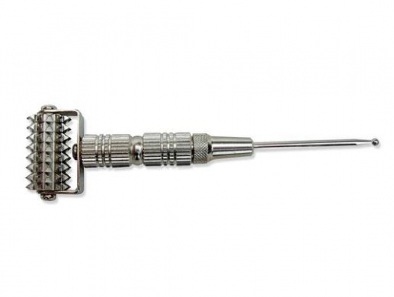 Multifunktionaler Dermaroller mit gefederten Taster. Der Griff des versilberte Dermaroller kann auch zur Massage der Hände und Füße benutzt werden.