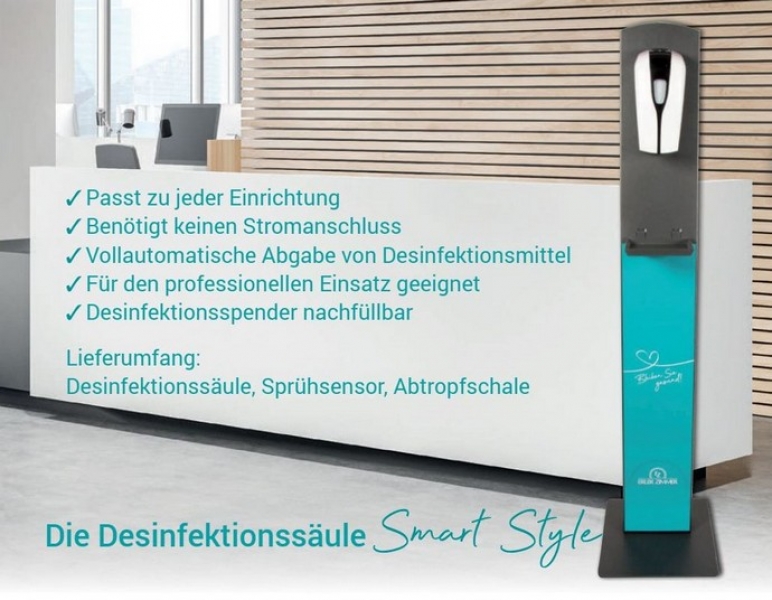 Unsere Desinfektionssäule Smart Style ist das vollautomatische, kontaktfreie Desinfektionssystem für verantwortungsbewußte Anwender.