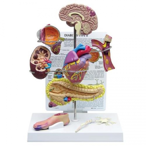 Das Typ II-Diabetes-Set umfasst ein Miniaturgehirn, ein Auge, ein Herz, eine Niere, eine Arterie, eine Bauchspeicheldrüse, eine Nervenzelle und Fußmodelle.