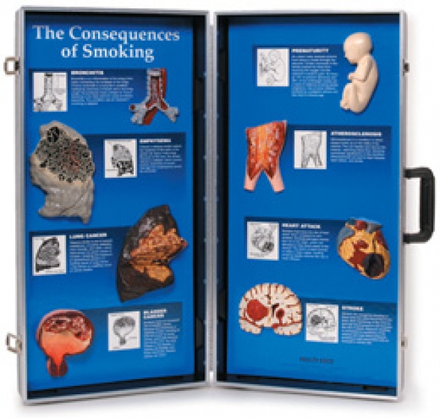 Jedes Modell ist fest in dem tragbaren Kofferdisplay angebracht, und die Begleittexte vermitteln unmissverständlich mit einfachen Worten ihre gesundheitsrelevante Aussage. Ideal für Messen und Ausstellungen im Rahmen der Gesundheitsvorsorge, für Schulen, Krankenhäuser, Kurse zur Raucherentwöhnung oder den Arbeitsplatz.