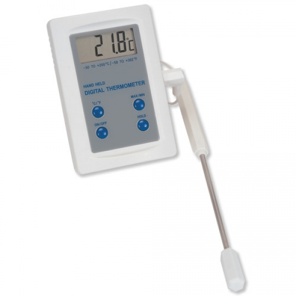 Einstechthermometer mit Hold- und Min/Max-Funktion in stabilem Plastikgehäuse und Temperaturfühler aus rostfreiem Edelstahl. Mit Umschaltmöglichkeit °C/°F, Ein/Ausschalter, Aufhängeöse und ausklappbarer Schrägstellstütze.