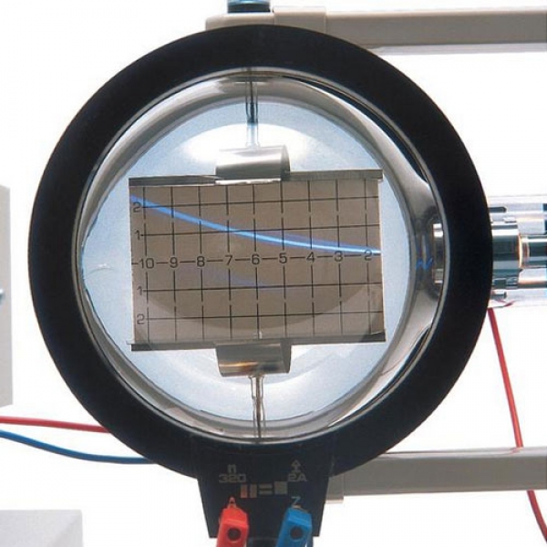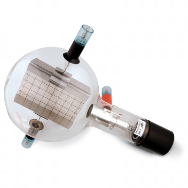 Hochevakuierte Elektronenröhre mit fokussierender Elektronenkanone und gegen die Strahlachse geneigtem Leuchtschirm, auf dem der Strahlverlauf zur Untersuchung von Elektronenstrahlen in elektrischen und magnetischen Feldern sichtbar gemacht wird.