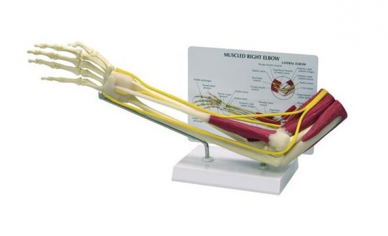 Das Ellenbogenmodell mit Muskeln ist ein normaler rechtsseitiger Ellbogen (vom Humerus bis zur Hand) und umfasst: Bizeps brachii, brachialis, Pronator Teres und Supinator Muskeln; distale, mediale und proximale Phalangen, Humerus, metacarpal, Daumen mit Endphalanx; Speichen- und Ellenknochen; Streckmuskel carpi radialis brevis,