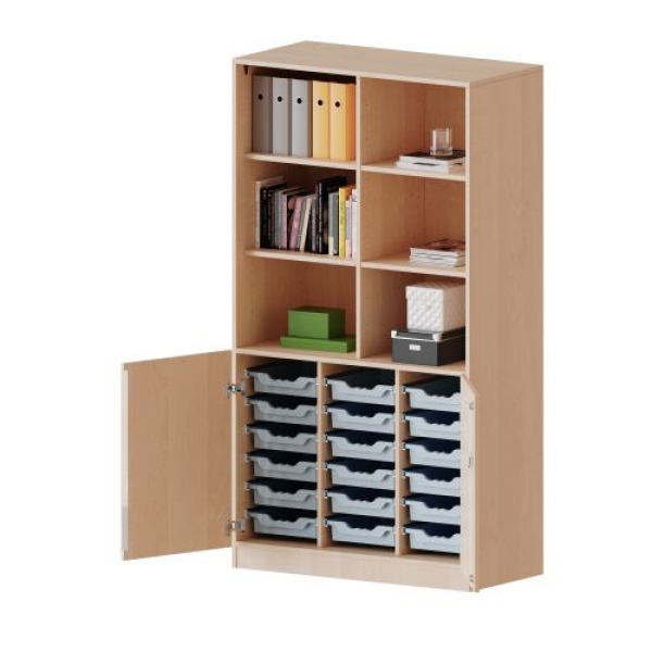 | | ErgoTray Kombi-Schrank mit 18 flachen Boxen, 5 OrdnerhöhenVersandkostenfreie Lieferung! 2 OH unten mit Türen und 18 flachen ErgoTray Boxen, oben 3 OH Regal, mit Sockel, mit Mittelwand, B/H/T: 104,5x190x50 cm