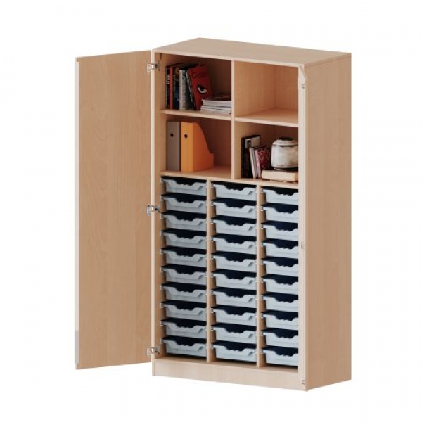 Materialschrank, BxHxT 104,3x190x50 cm 2 Türen, abschließbar, Dreholive,2 verstellbare Einlegeböden 1 fester Fachbodenunten: 2 Trennwände, 3x10 flache Kunststoffkästen