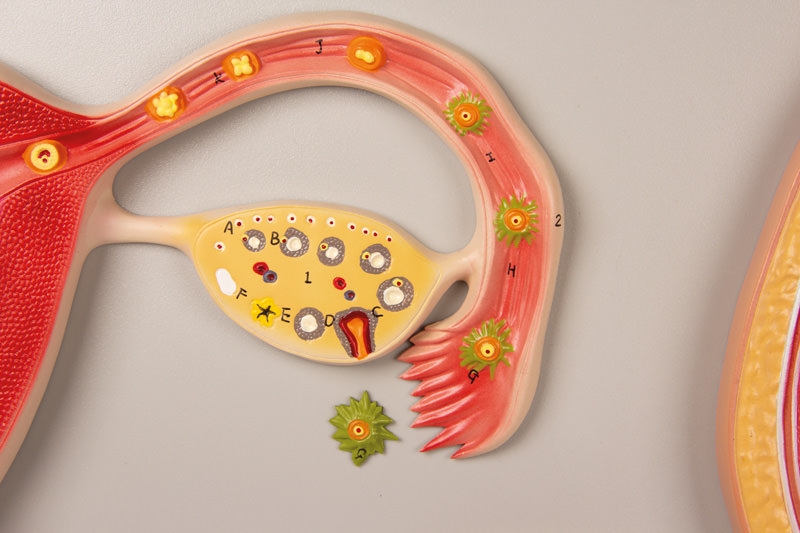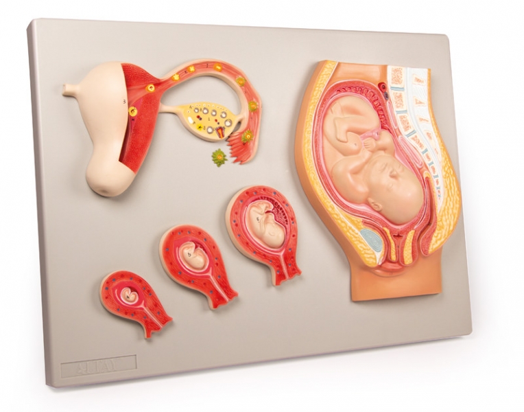 Dieses Modell zeigt die fetale Entwicklung vom unbefruchteten Ei bis zum Entwicklungsstand im neunten Monat.